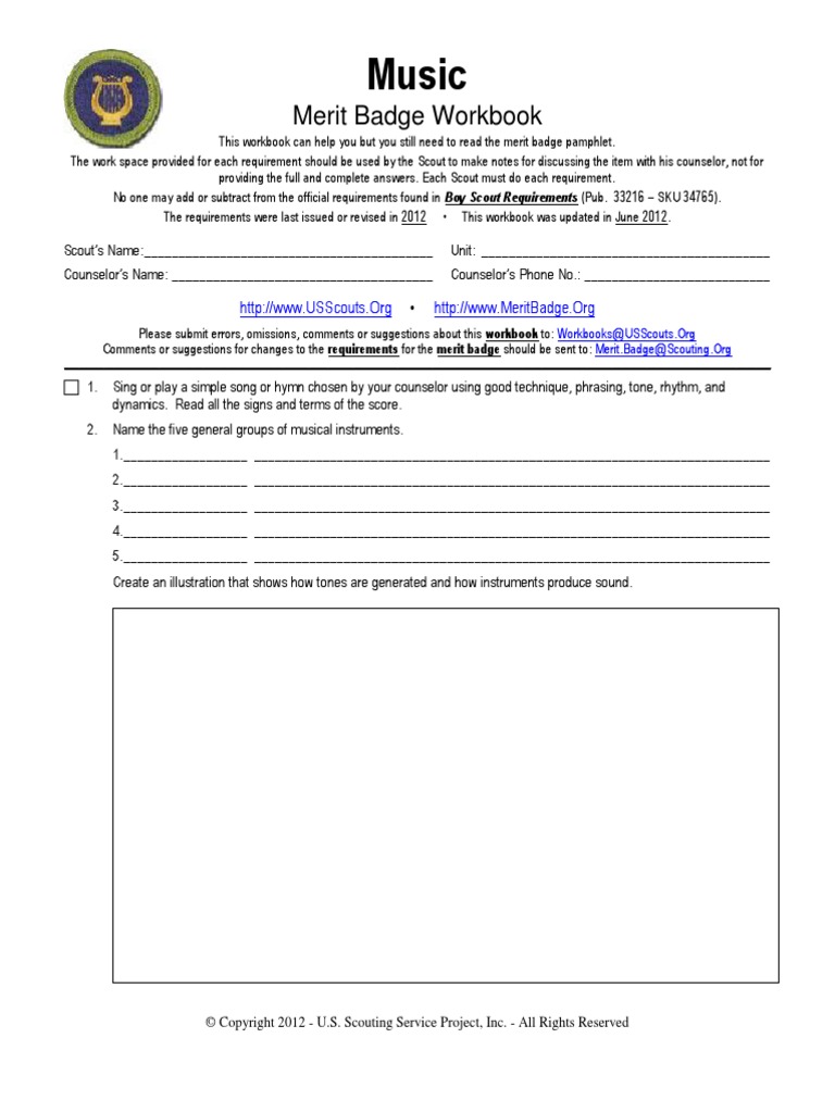 Merit badge counselors may not require the use of this or any similar workbooks. Free interactive exercises to practice online or download as pdf to print. Music merit badge worksheet requirement 1 play a standard musical instrument satisfactorily as used in an orchestra. Music worksheets and online activities. Some of the worksheets displayed are , rifle shooting, astronomy, 2019 merit badge prerequisites, , personal fitness merit badge work, sustainability merit badge requirements, energy. In this music worksheet, students use their workbook to answer short answer questions about music and instruments. Pamphlet, worksheet, sample powerpoint, and youtube video. Students complete 4 questions total to get their merit badge. *** activities for the youth lead patrol ***. Requirements for the music merit badge: Musical instrument families bluegrass bluegrass music is a form of american roots music, and a subgenre of country music. Class times are hawaii standard time. By the time you fulfill the requirements for the programming merit badge, you will be able to work a little of that magic yourself.