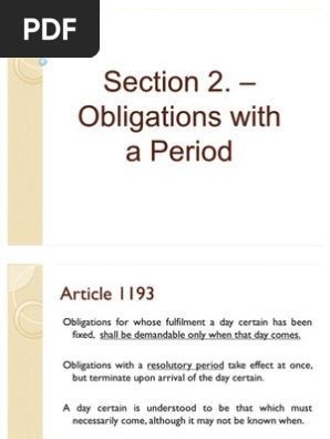 Chapter 3 Sec 1 6 Arts 1179 1230 Chapter 3 Section 2 Obligations With A Period Articles 1193 1198 1 Meaning Of An Obligation With A Period It Is Course Hero from www.coursehero.com Every obligation which contain a resolutory condition shall also be demandable, without prejudice to the effects of the happening of the event. Deemed one with a period. For example, a buyer who agrees to pay the price if the seller agrees to deliver the item is a resolutory condition suspends the extinction of an obligation, not its existence.27 thus, an here is how mignault has summarized the immediate effect of obligations subject to a resolutory condition A pure obligation is one that is demandable at once because it does not depend upon a future or uncertain event, not on a past event unknown to the parties and is not an obligation with a resolutory condition. You've reached the end of your free preview. Obligations with a resolutory period take effect at once, but terminate upon arrival of the day certain. There are strong obligations such as rules and necessities, and weak obligations such as advice. It refers to the party's failure to comply with an obligation already extant, not failure of condition to make obligation binding.